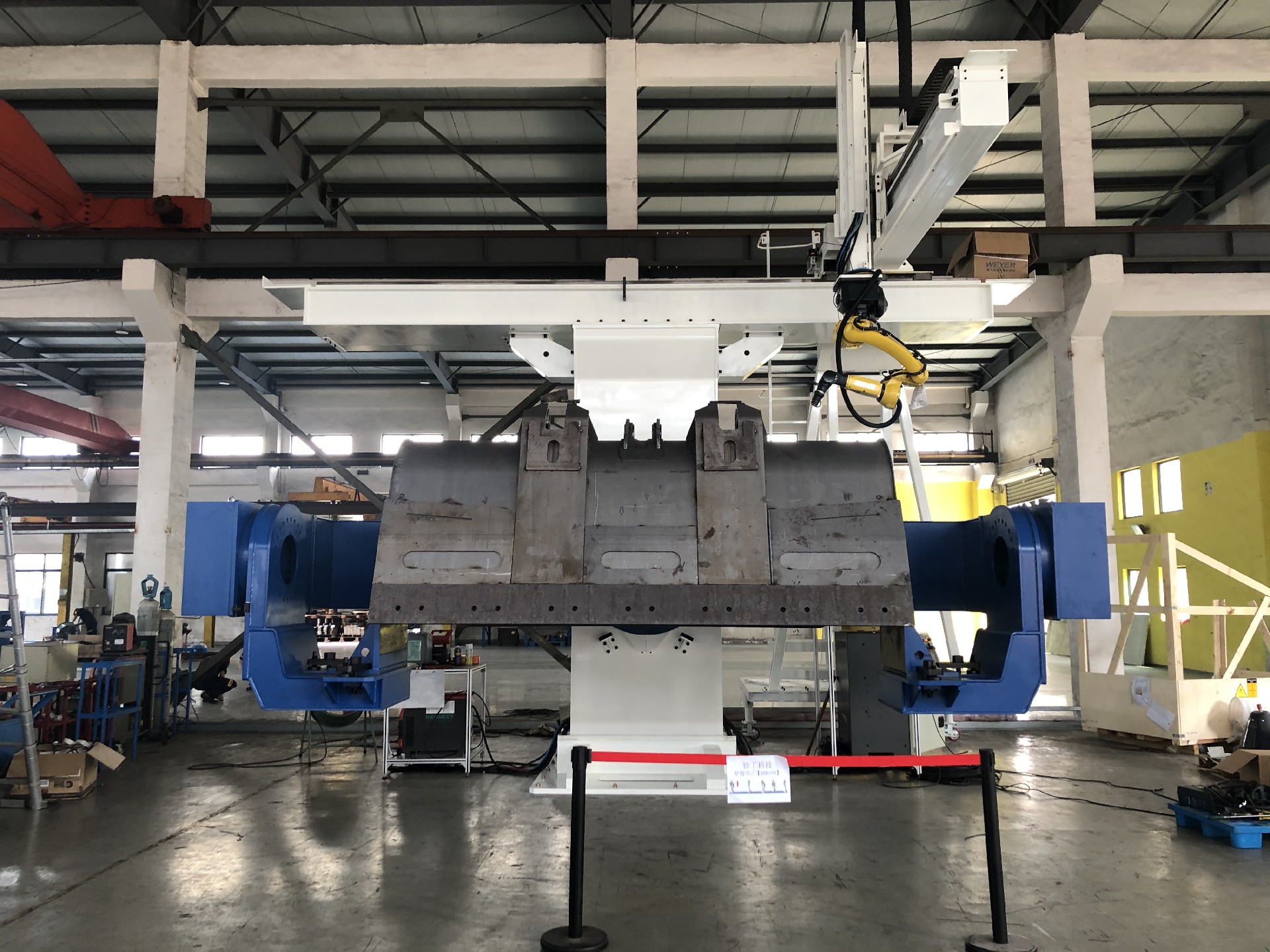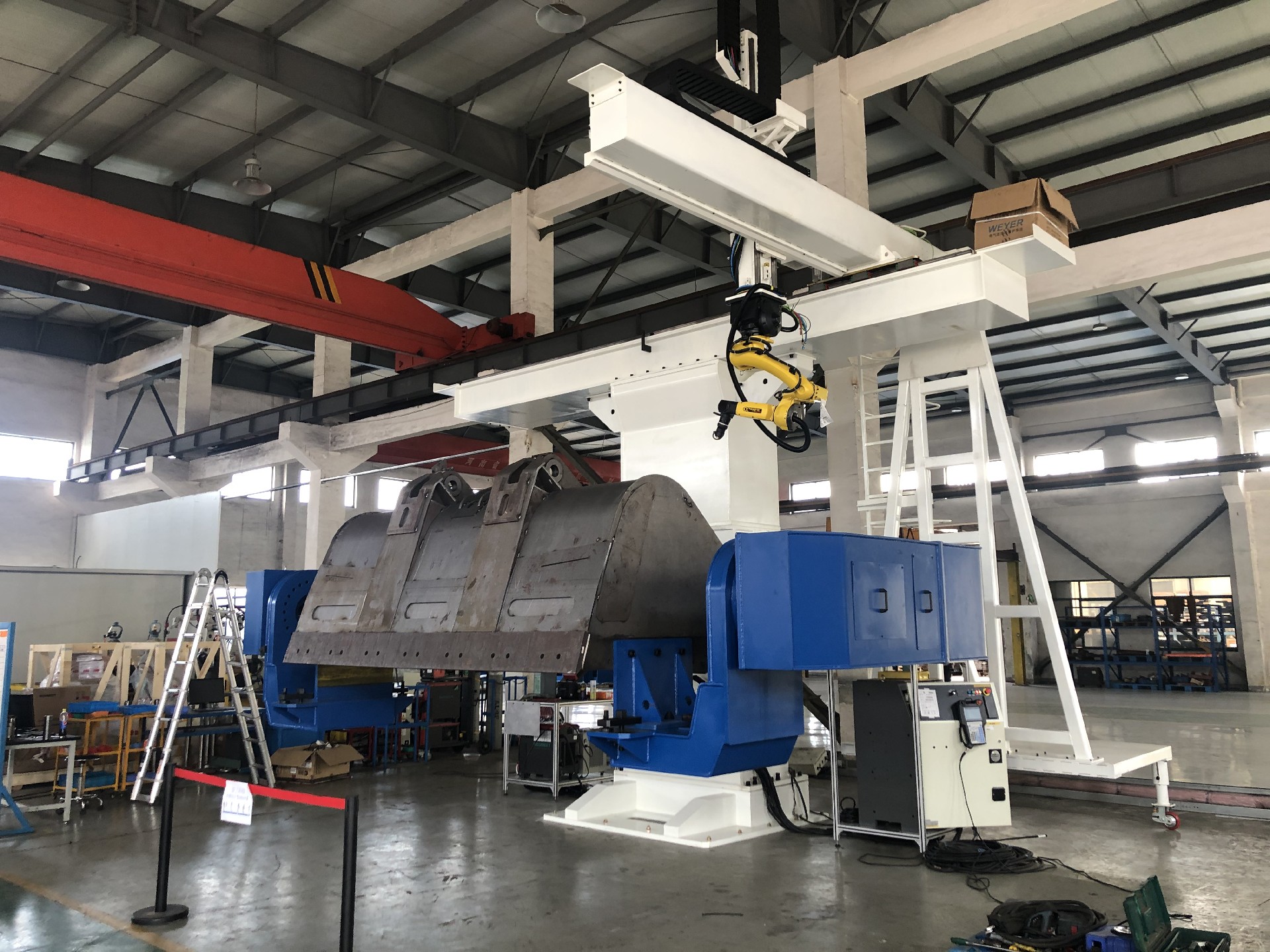 7. 系統(tǒng)柔性與生產(chǎn)效率:11軸聯(lián)動(dòng)的設(shè)計(jì),加上自動(dòng)化的傳感器和夾具,使得工作站能夠處理不同尺寸和形狀的鏟斗工件,減少了更換工裝夾具的時(shí)間,提高了生產(chǎn)效率和系統(tǒng)的柔性,適合于多品種、小批量的生產(chǎn)模式。