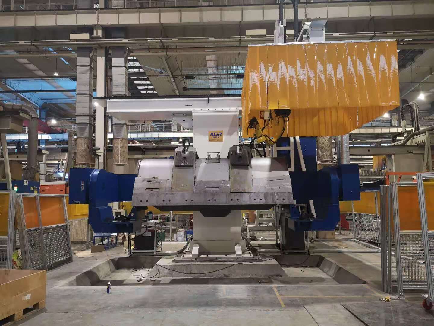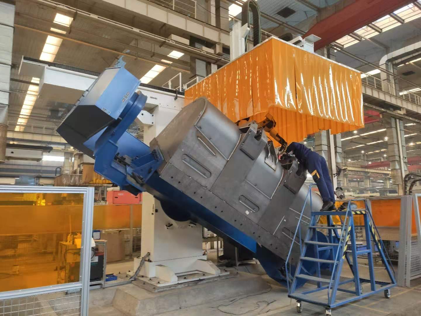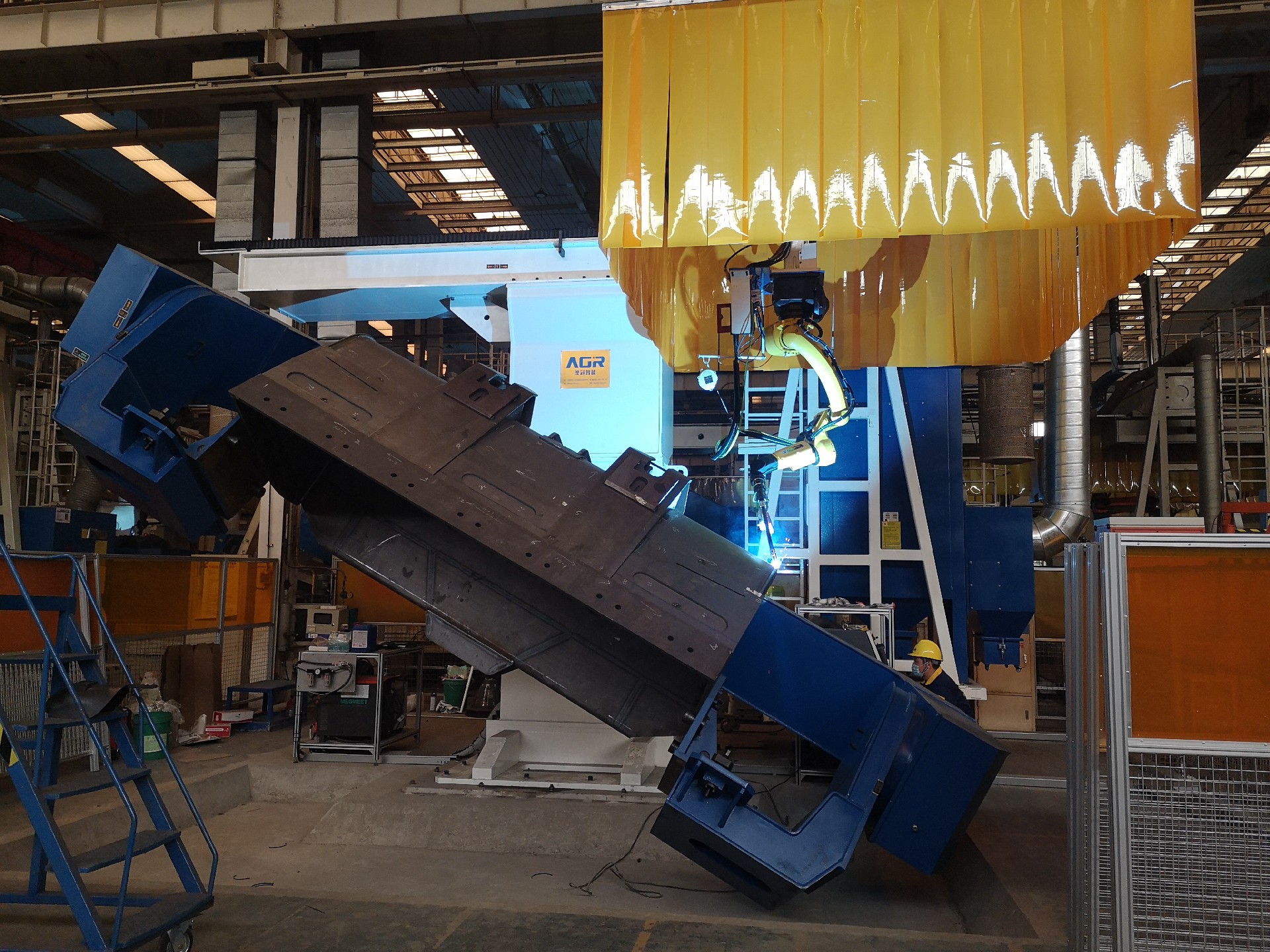 裝載機(jī)鏟斗焊接機(jī)器人工作站,采用11軸聯(lián)動(dòng)機(jī)器人焊接系統(tǒng)。這種工作站的設(shè)計(jì)不僅優(yōu)化了空間利用,還顯著提高了生產(chǎn)效率和焊接質(zhì)量。
