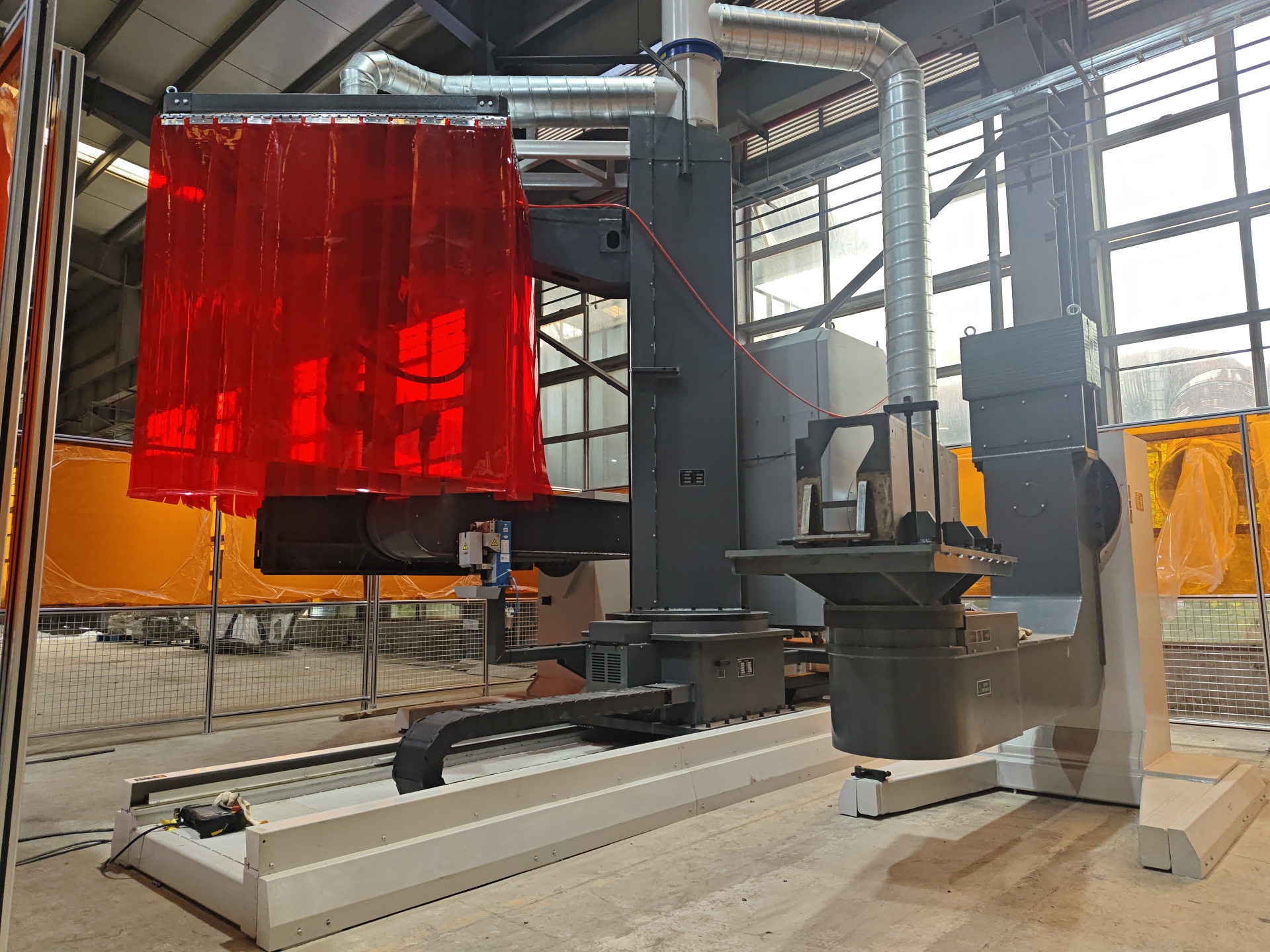 車(chē)架焊接機(jī)器人工作站主要由一臺(tái)地軌倒吊三軸行走機(jī)構(gòu)(X+Z+旋轉(zhuǎn))、一臺(tái)松下機(jī)器人、一套松下焊接設(shè)備、兩臺(tái)負(fù)載1噸L型兩軸伺服聯(lián)動(dòng)變位機(jī)以及其余周邊設(shè)備構(gòu)成。