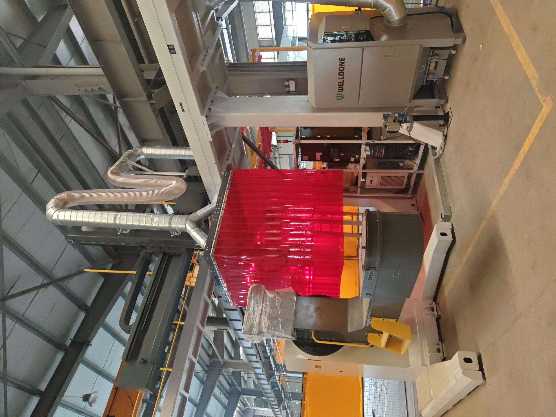 車架焊接機(jī)器人工作站主要由一臺(tái)地軌倒吊三軸行走機(jī)構(gòu)(X+Z+旋轉(zhuǎn))、一臺(tái)松下機(jī)器人、一套松下焊接設(shè)備、兩臺(tái)負(fù)載1噸L型兩軸伺服聯(lián)動(dòng)變位機(jī)以及其余周邊設(shè)備構(gòu)成。