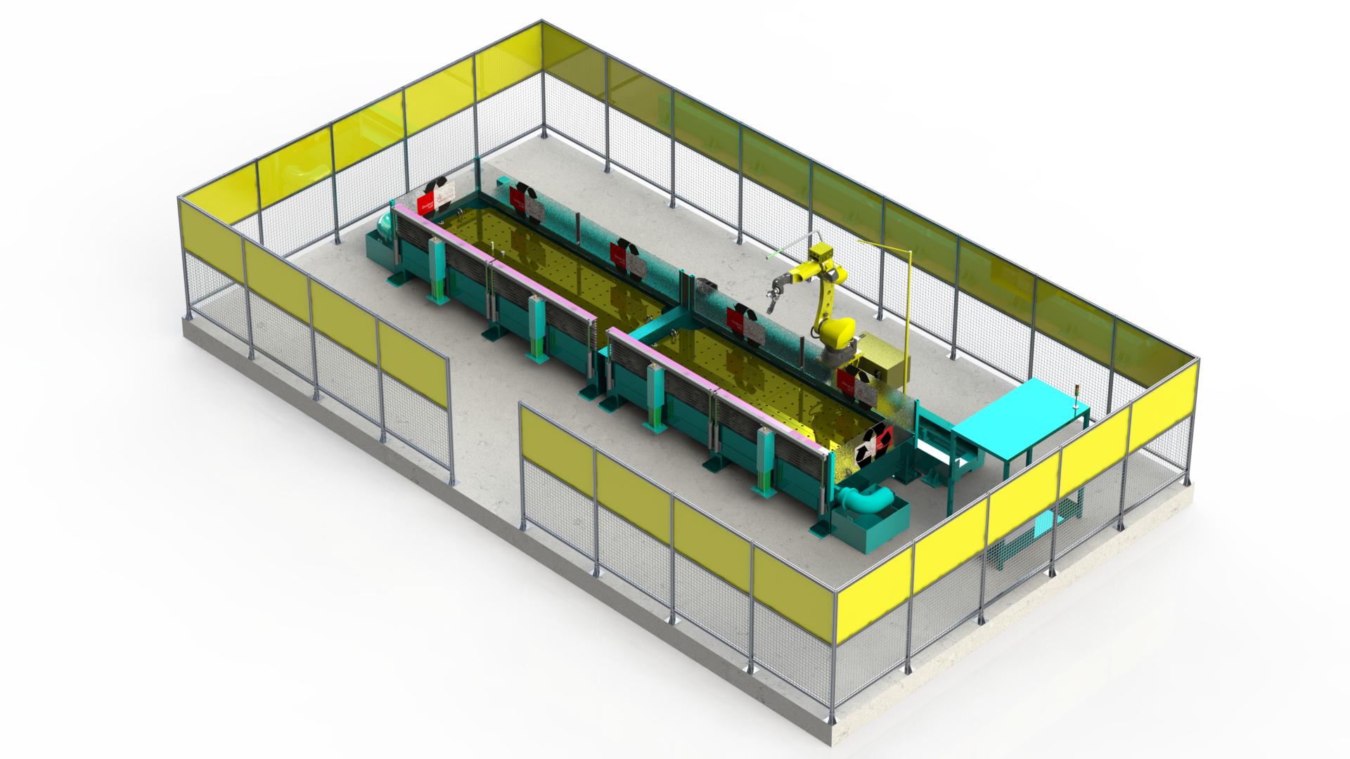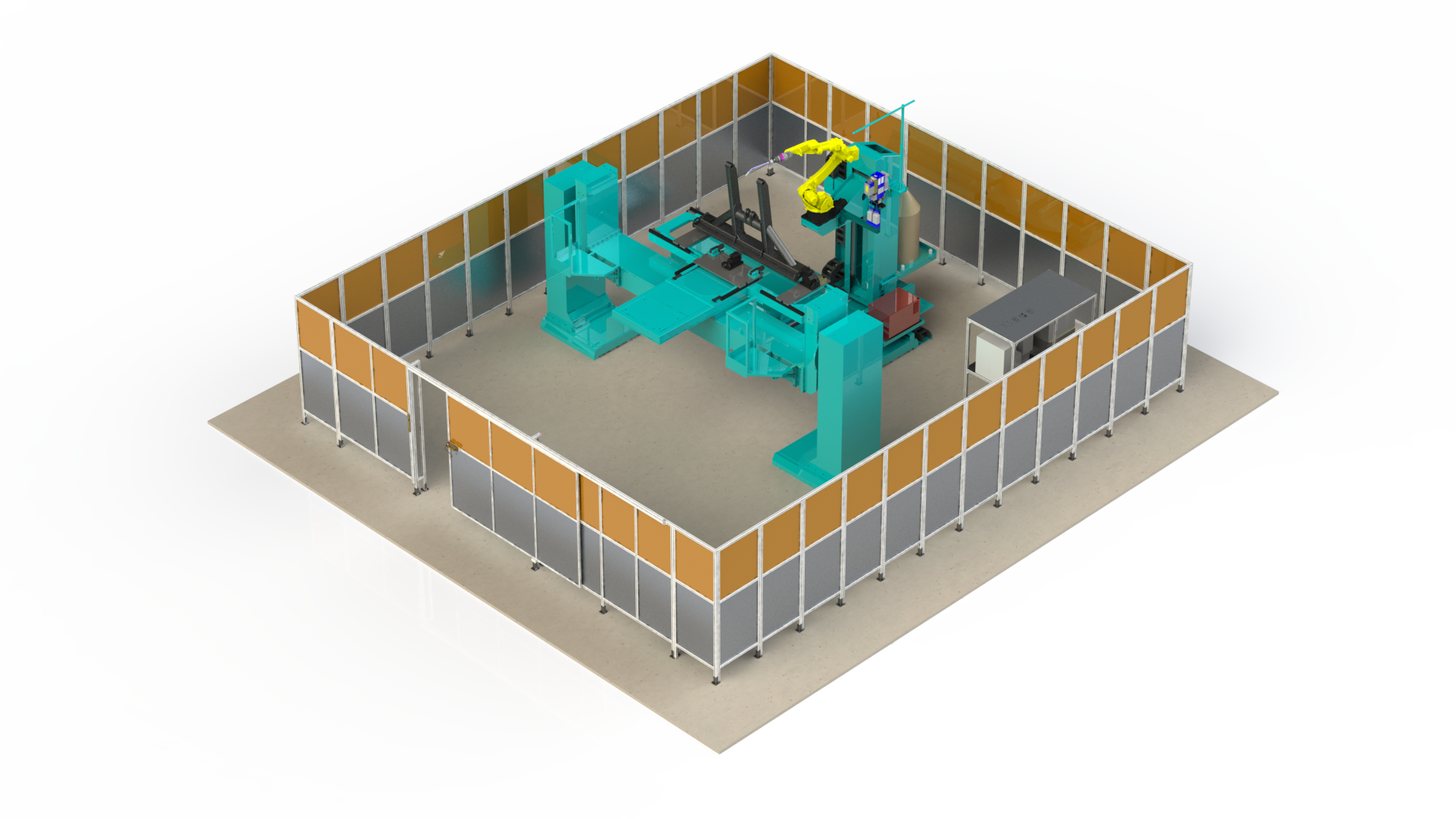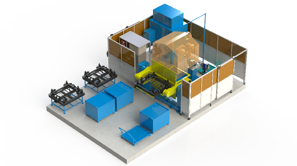 5機(jī)聯(lián)動(dòng)機(jī)器人焊接系統(tǒng);變位機(jī)承載能力達(dá)到1噸,適用于多型號(hào)動(dòng)臂斗桿結(jié)構(gòu)件的焊接;反變形及夾緊定位一體化設(shè)計(jì)伺服夾具,與工件自 動(dòng)化柔性輸送系統(tǒng)配合,可實(shí)現(xiàn)多種型號(hào)工件的自動(dòng)裝夾。
