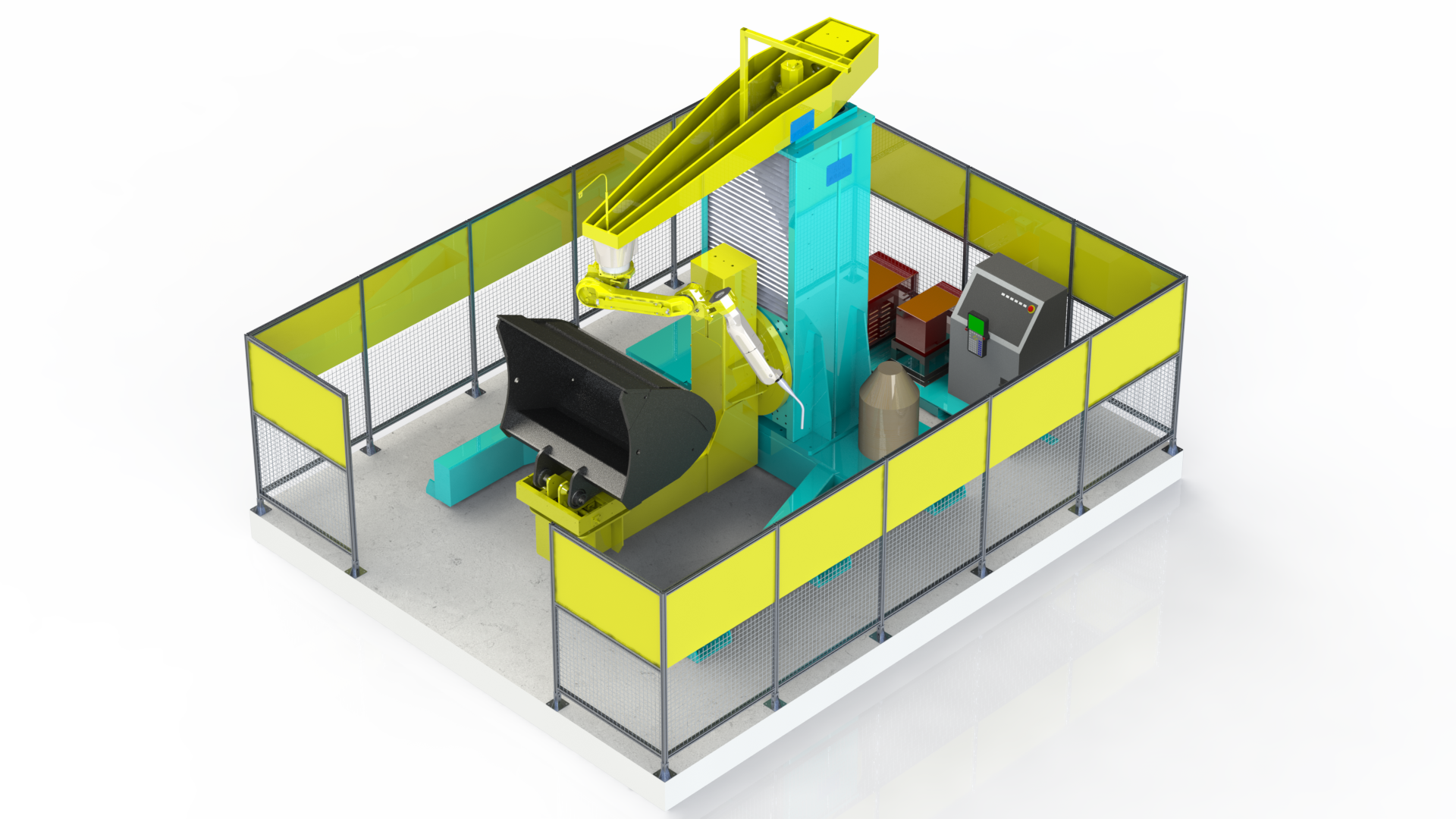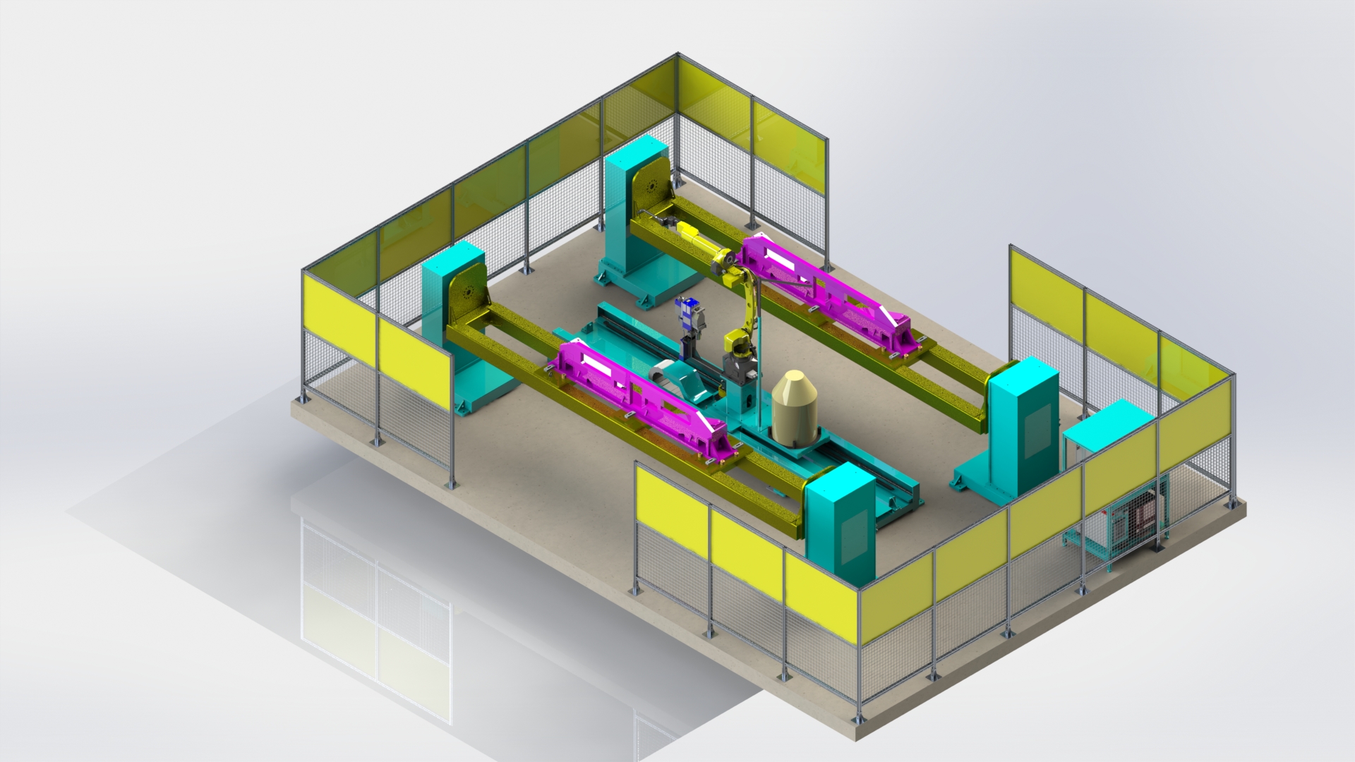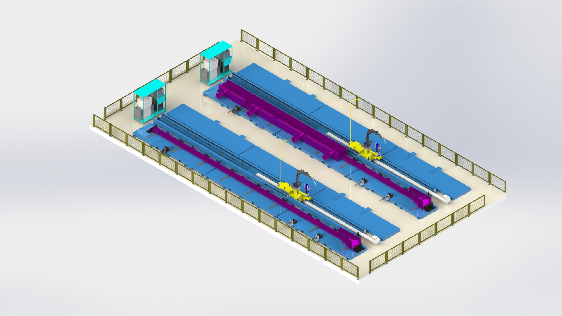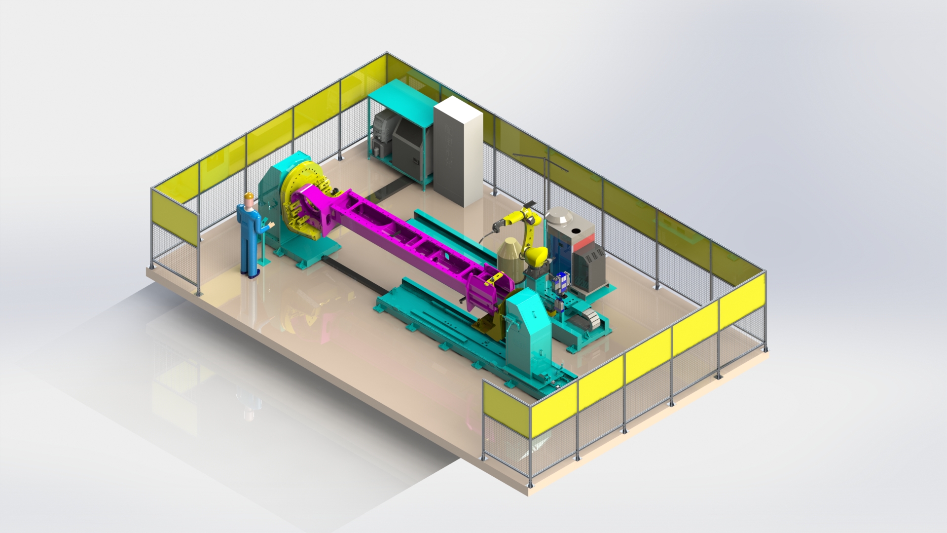 5機(jī)聯(lián)動(dòng)機(jī)器人焊接系統(tǒng);變位機(jī)承載能力達(dá)到1噸,適用于多型號(hào)動(dòng)臂斗桿結(jié)構(gòu)件的焊接;反變形及夾緊定位一體化設(shè)計(jì)伺服夾具,與工件自 動(dòng)化柔性輸送系統(tǒng)配合,可實(shí)現(xiàn)多種型號(hào)工件的自動(dòng)裝夾。
