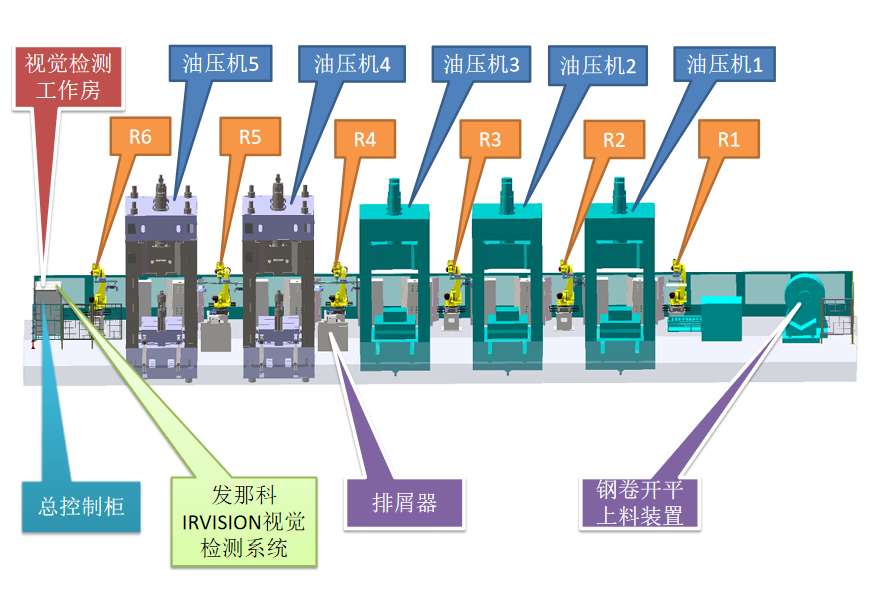 客戶要求對割草機殼體油壓機工件的加工從上料到檢測、碼垛全程實現(xiàn)無人化、自動化。產線配備6臺發(fā)那科6軸機器人 ,5臺油壓機,1套鋼卷上料系統(tǒng),1套視覺系統(tǒng),6套末端執(zhí)行系統(tǒng),5臺相機加鏡頭,電氣控制等組成。