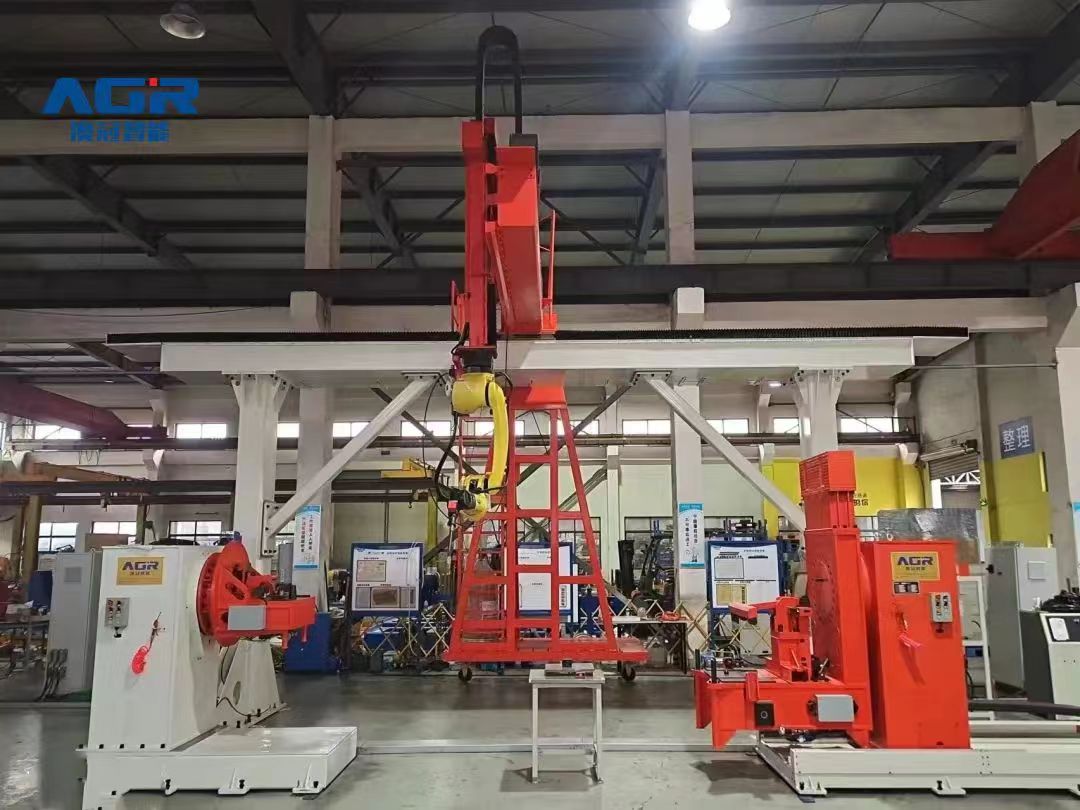 變位機(jī)用的是兩軸H型變位機(jī),H系列兩軸變位機(jī)是澳冠智能標(biāo)準(zhǔn)化產(chǎn)品,為最大范圍適應(yīng)工件各條焊縫在**位置的焊接,特配備此兩軸H型變位機(jī),H型變位機(jī)適應(yīng)性和變換角度范圍最廣,可以滿足臂架大部分焊縫在**位置的焊接。變位機(jī)及頭尾架均采用機(jī)器人廠家伺服電機(jī)驅(qū)動(dòng),由機(jī)器人控制器直接控制,作為機(jī)器人外部軸與機(jī)器人**聯(lián)動(dòng)。尾架可調(diào),可兼容一定范圍的工件長(zhǎng)度。