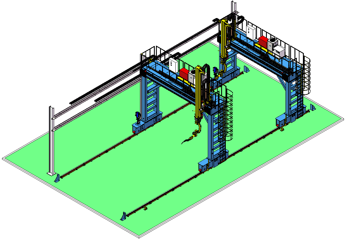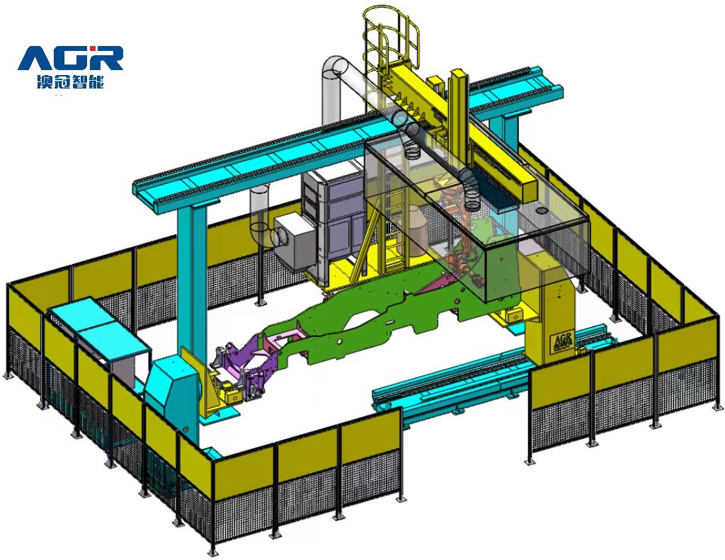 5機聯(lián)動機器人焊接系統(tǒng);變位機承載能力達到1噸,適用于多型號動臂斗桿結(jié)構件的焊接;反變形及夾緊定位一體化設計伺服夾具,與工件自 動化柔性輸送系統(tǒng)配合,可實現(xiàn)多種型號工件的自動裝夾。